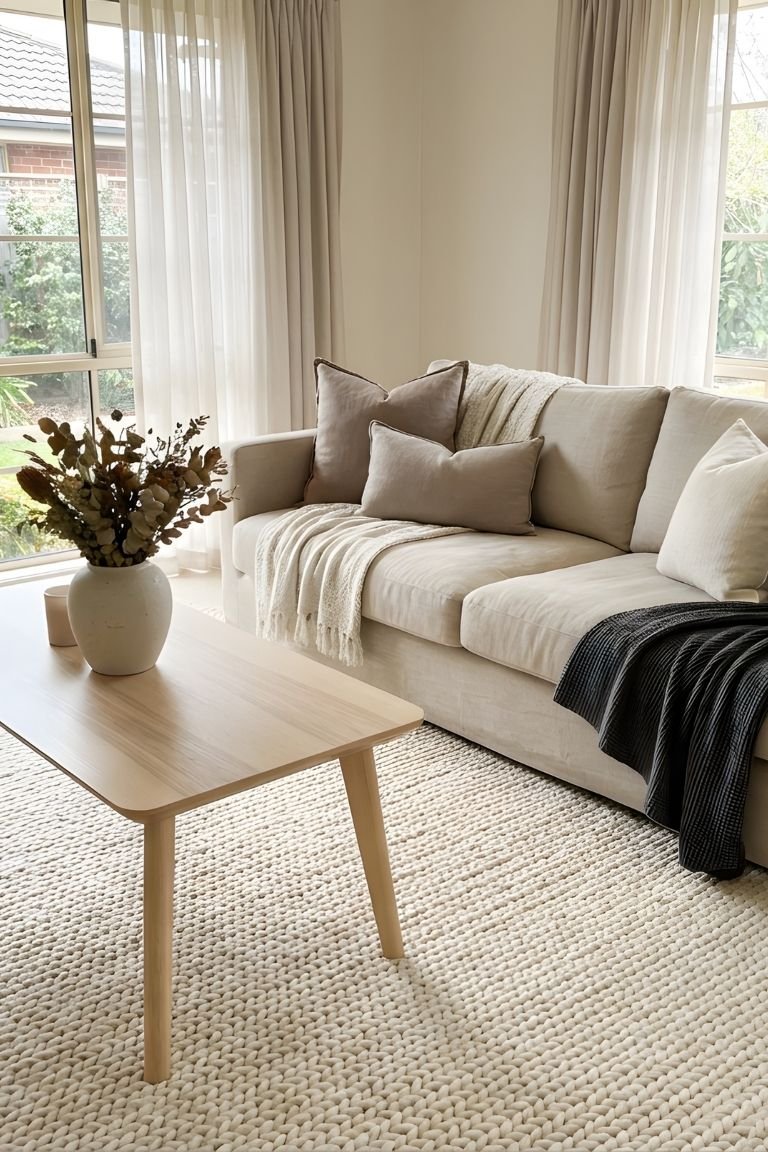 • Warm neutrals pair beautifully with wood furniture and soft textiles