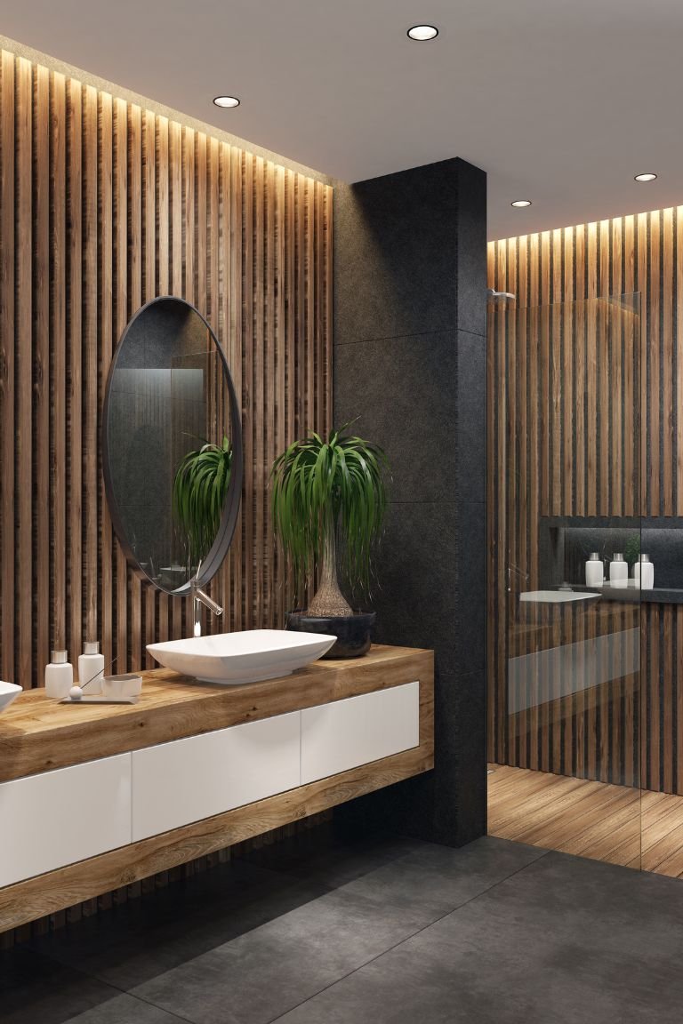 | Neutral walls | Warm wood vanity or shelving |